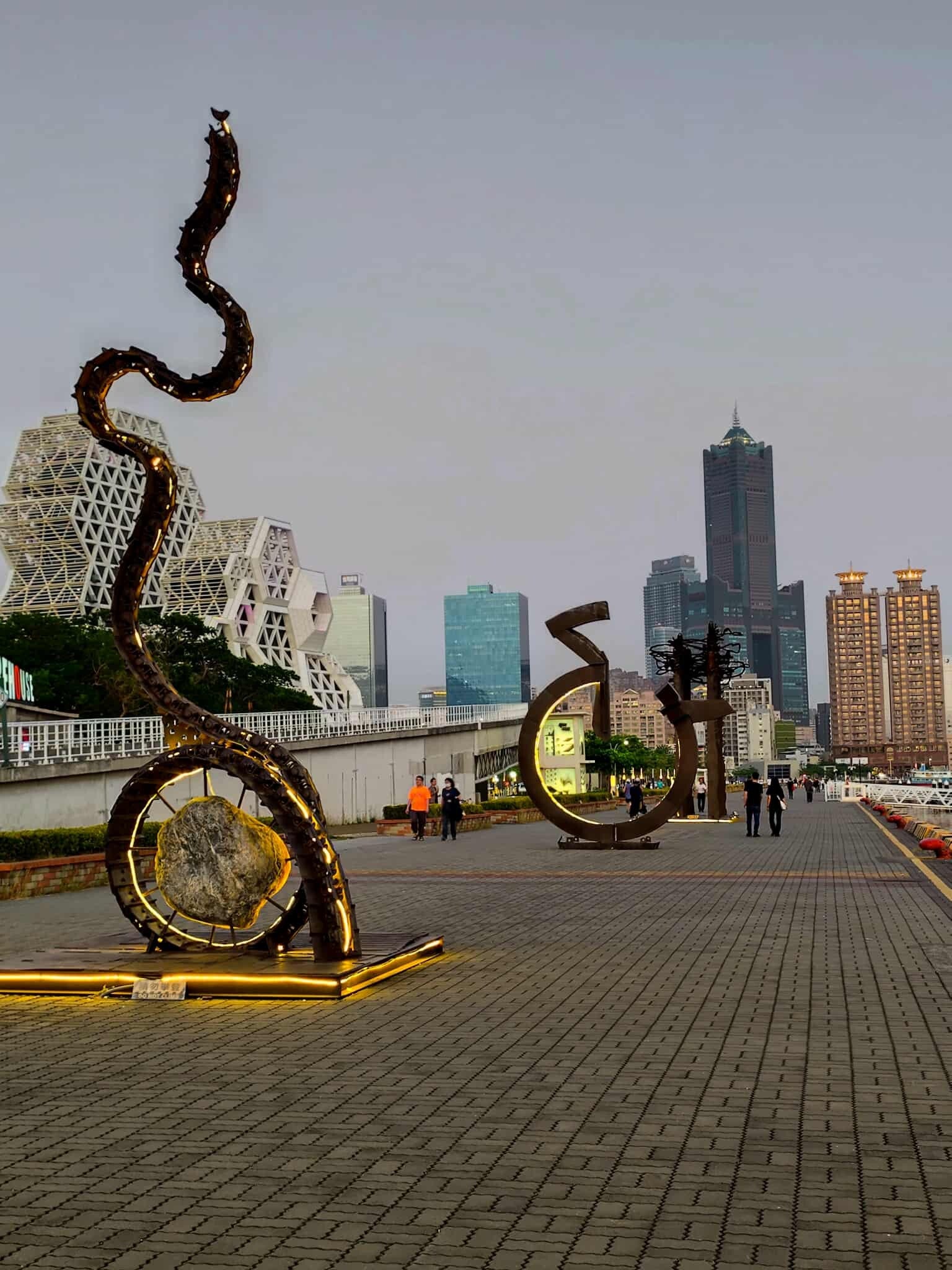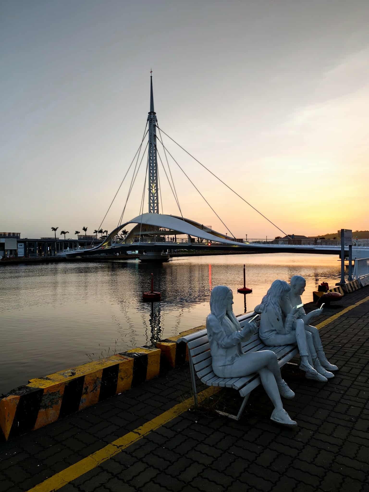 As I mentioned above, a walk from the Art Center to the Pier is a total must when in Kaohsiung. The part of the great Harbor Bridge is my favorite especially during sunset. Next to the bridge stand more impressive art pieces (the bench with the people staring on their mobile phones is my personal favorite) and during the night with all the lights the scene is even more impressive.